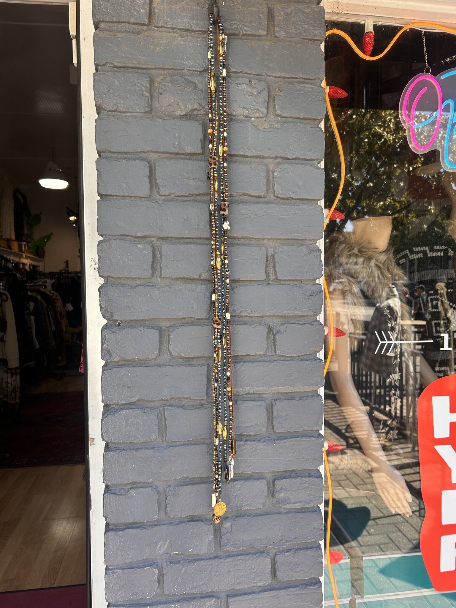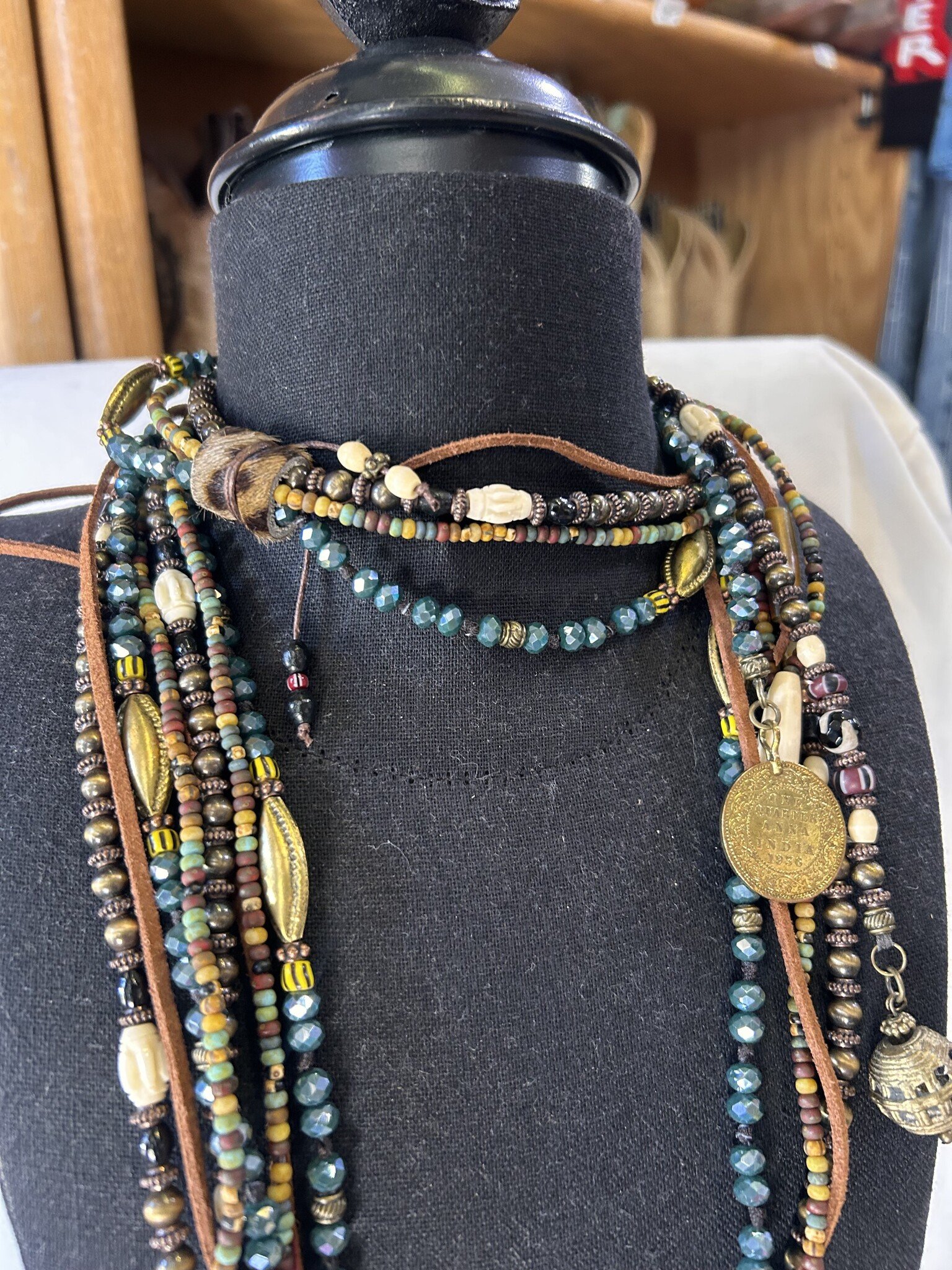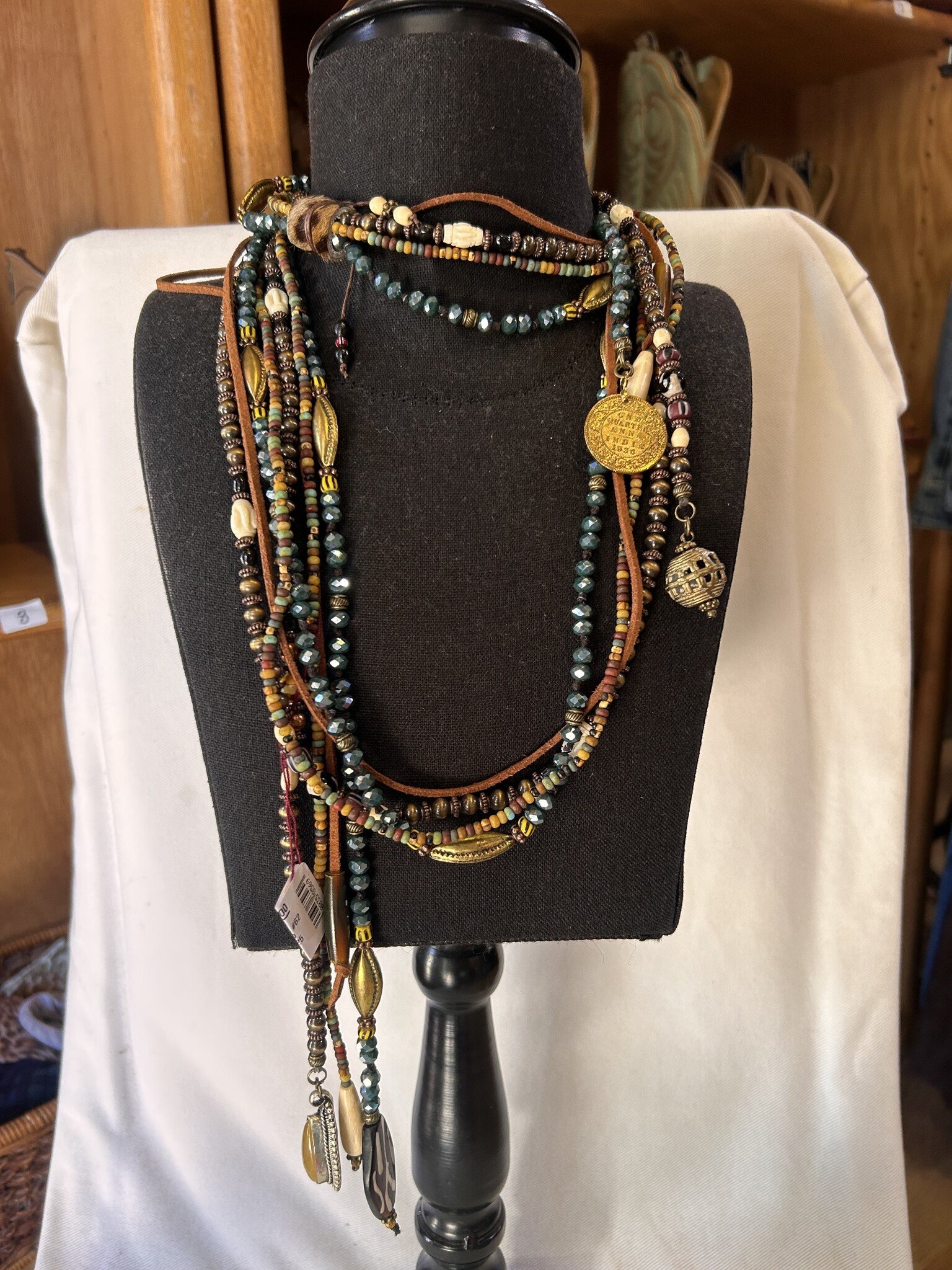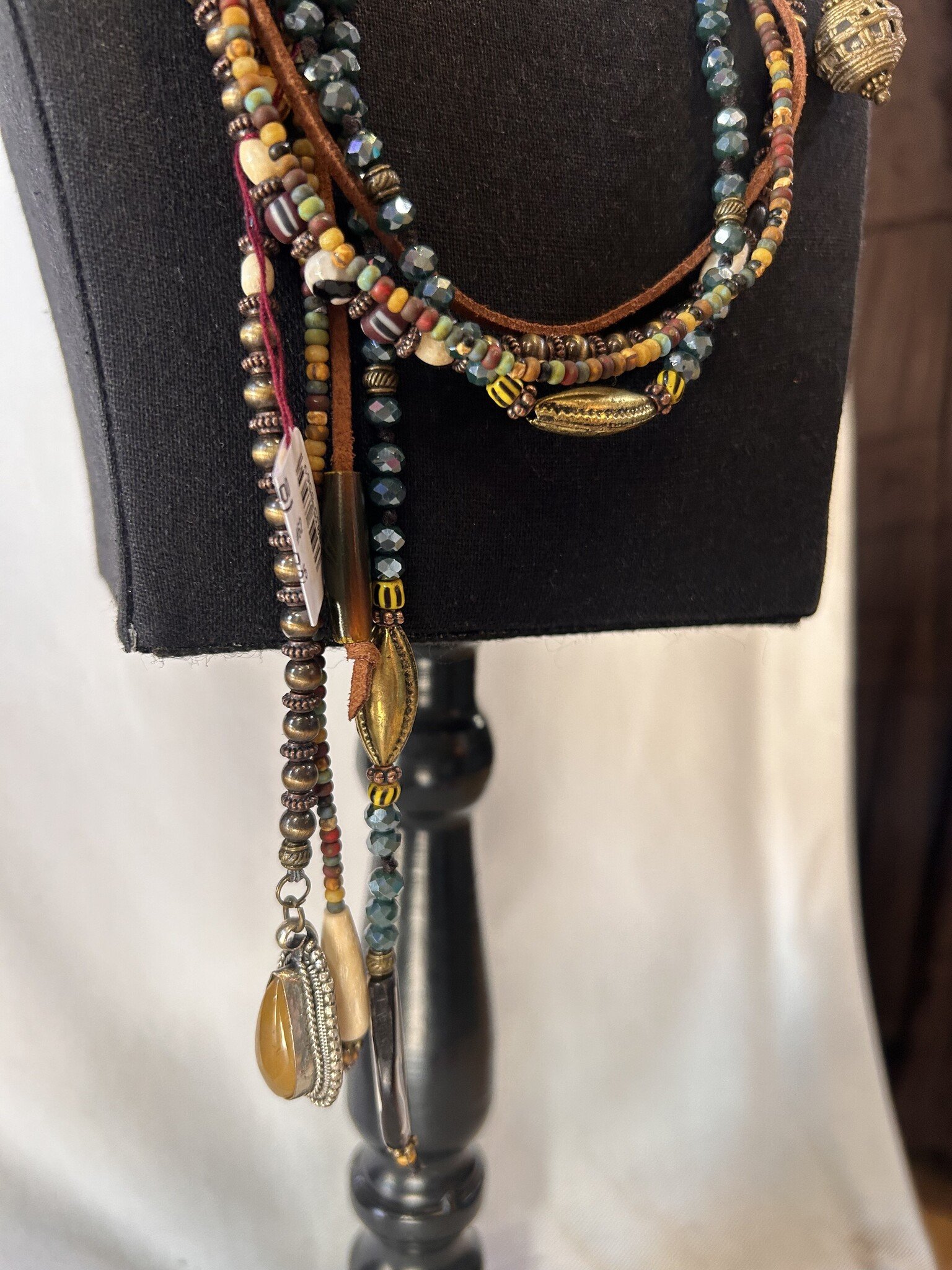 Handcrafted by designer Amy Kaplan, this stunning 68-inch lariat necklace blends earthy elegance with bohemian charm. Featuring strands of glass, wood, and metallic beads on soft suede leather, it’s accented with artisan charms and pendants for a truly one-of-a-kind look. Wrap it once, twice, or layer it for endless styling versatility.