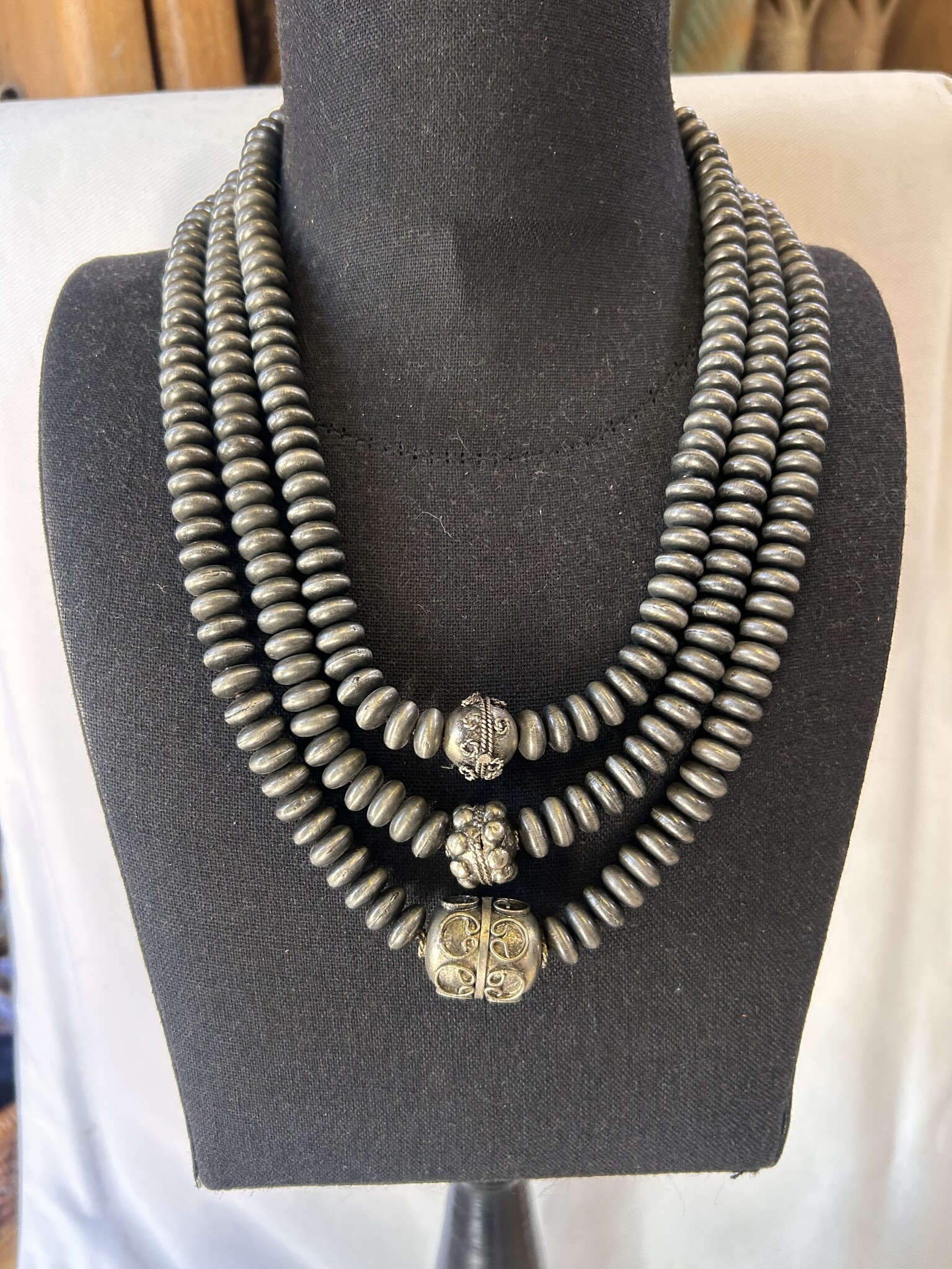 Make a bold statement with this handcrafted 21-inch necklace by Amy Kaplan, featuring three strands of elegant faux Navajo pearls. The design is accented with ornate silver-toned statement beads that add texture and depth, blending Southwestern charm with modern sophistication. Perfect for elevating denim, dresses, or evening wear, this piece brings timeless artistry and edge to any outfit.