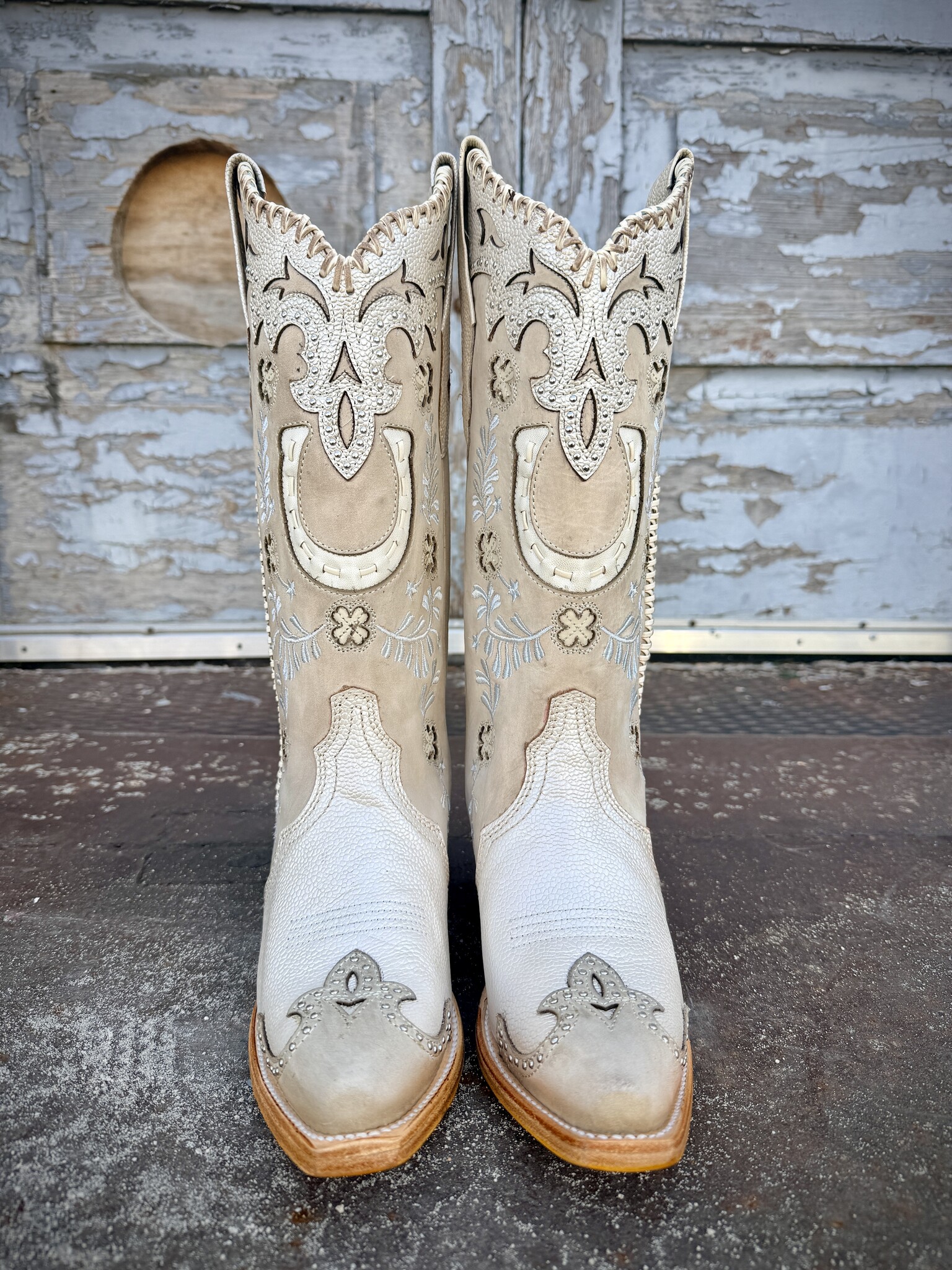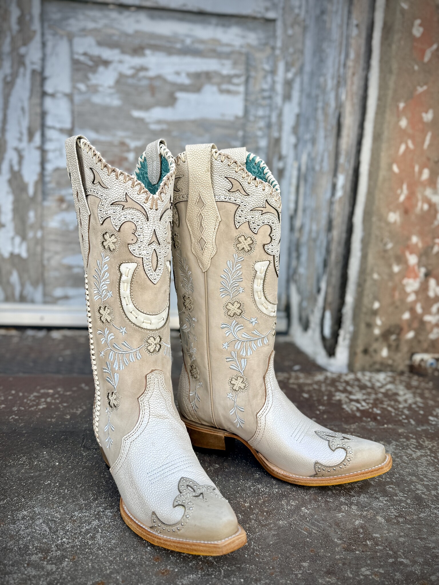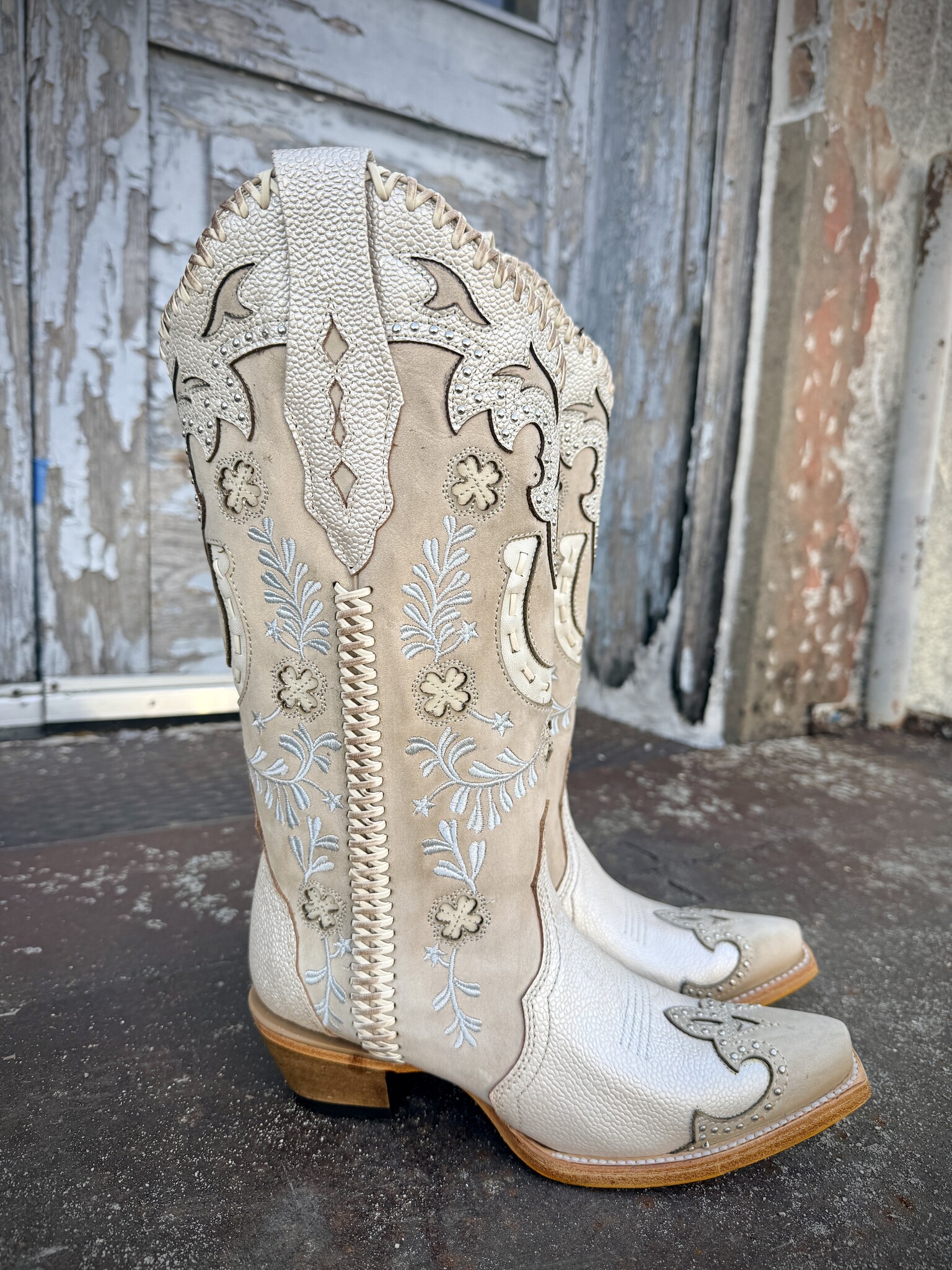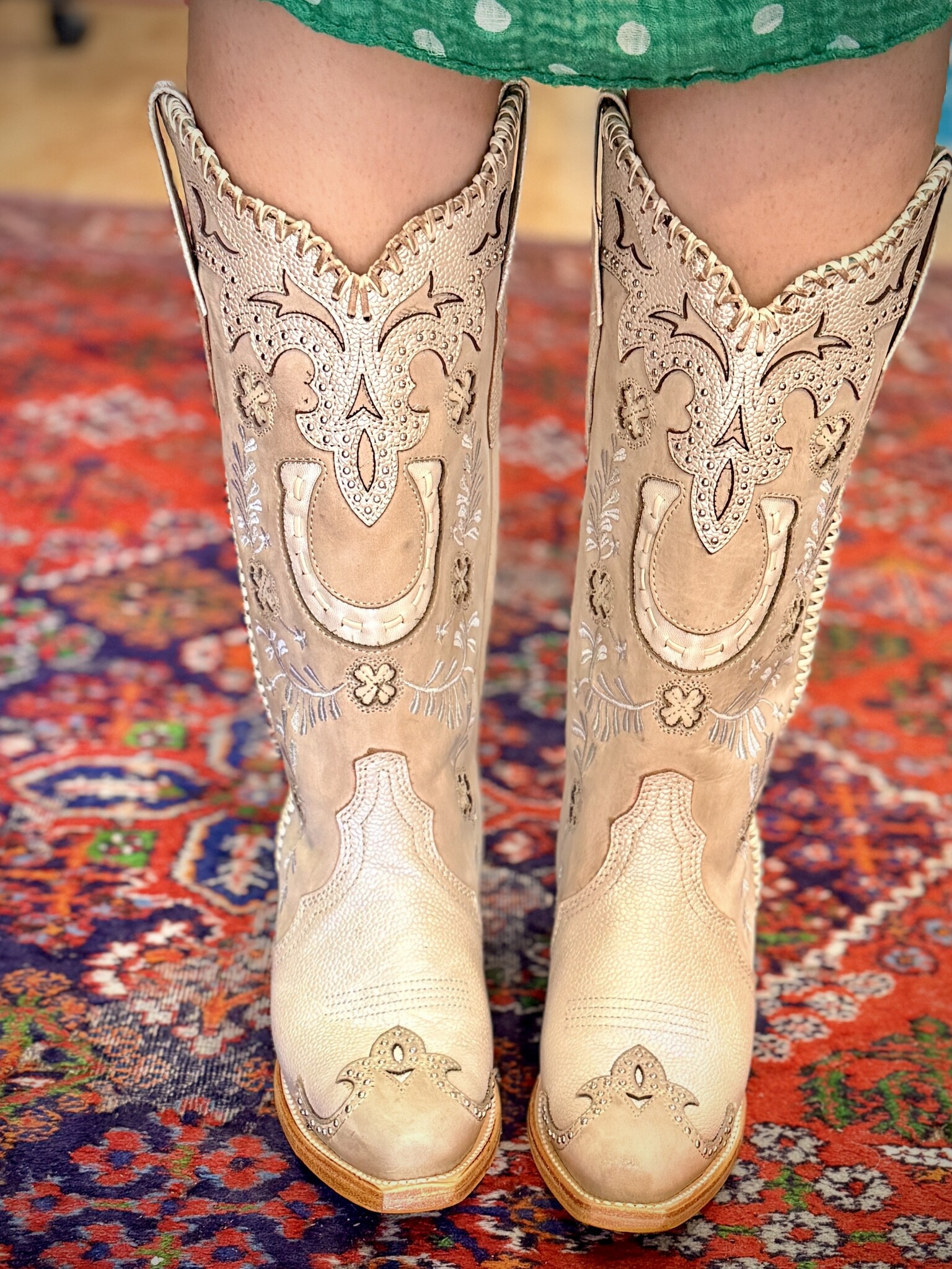 Step out in style with these artisanal Corral Boots. Featuring a sophisticated bone leather base, these boots showcase a signature horseshoe overlay accented by intricate embroidery and metallic studs. Unique handwoven details along the shaft add a premium, handcrafted touch to this Western staple.