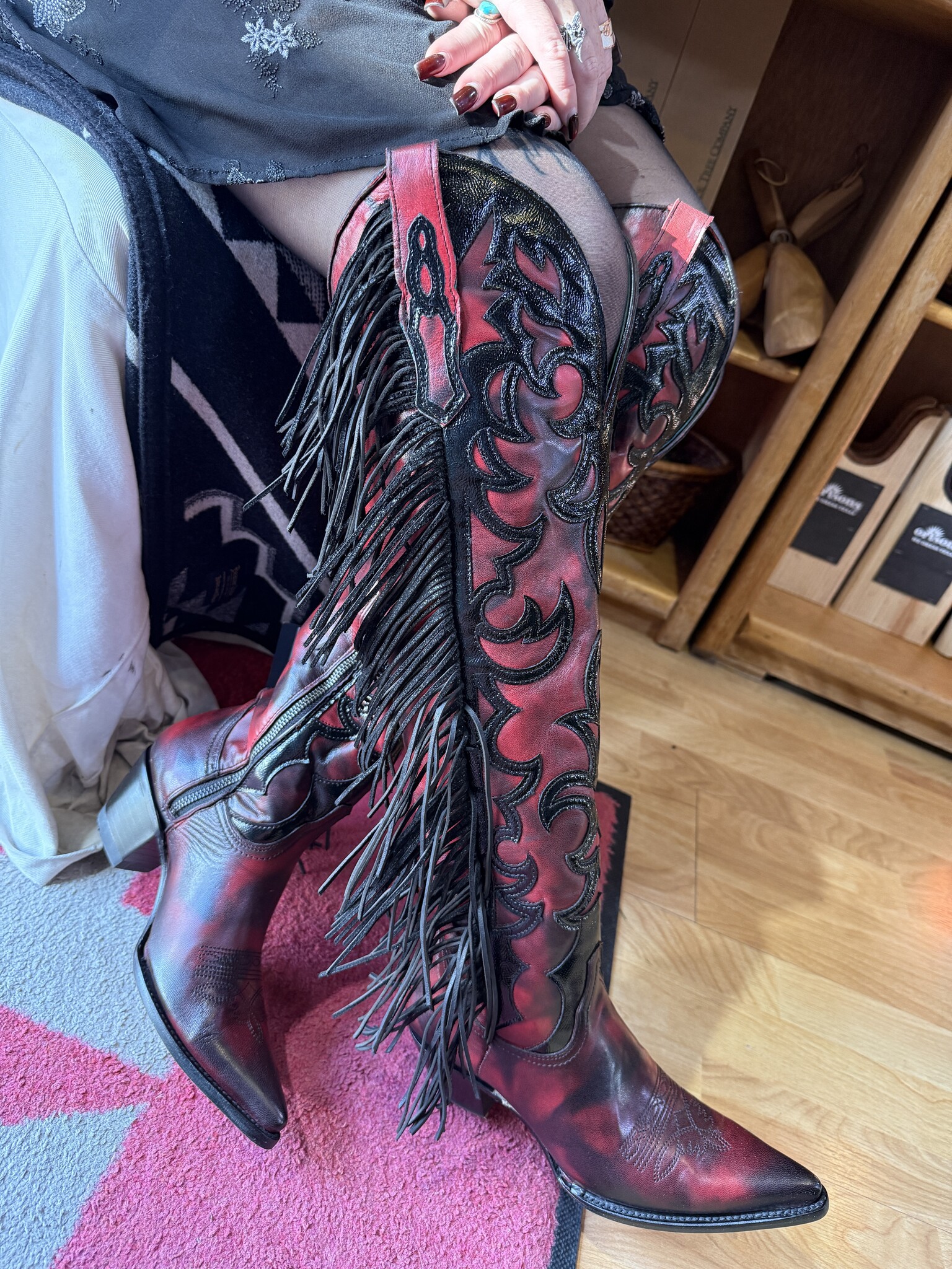 These stunning 21-inch shaft-height of red leather with gorgeous overlay and fringe will go perfectly with anything.