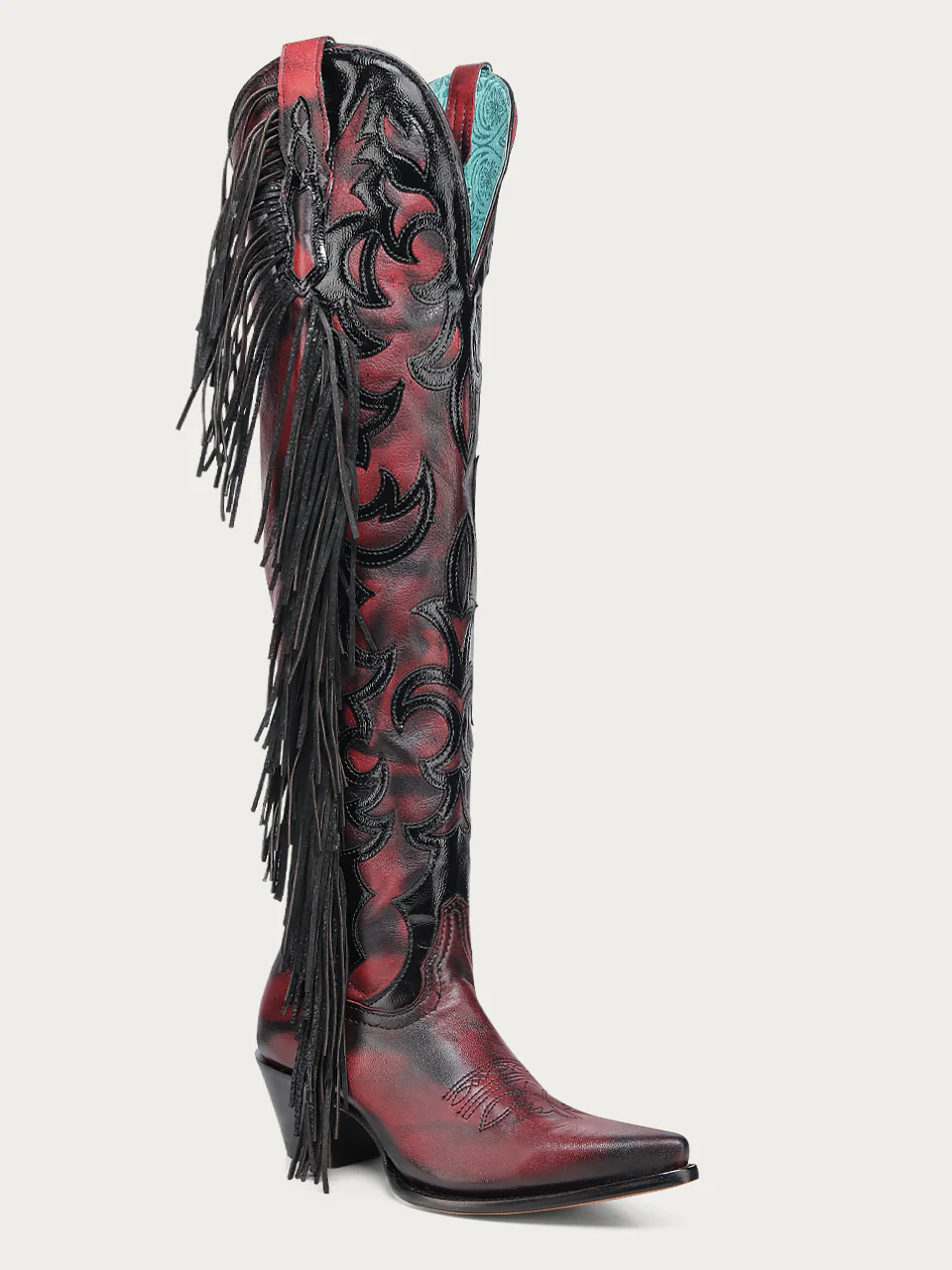CORRAL WOMEN'S RED EMBROIDERY AND OVERLAY WITH FRINGE TALL TOP POINTED LAMB COWBOY BOOT