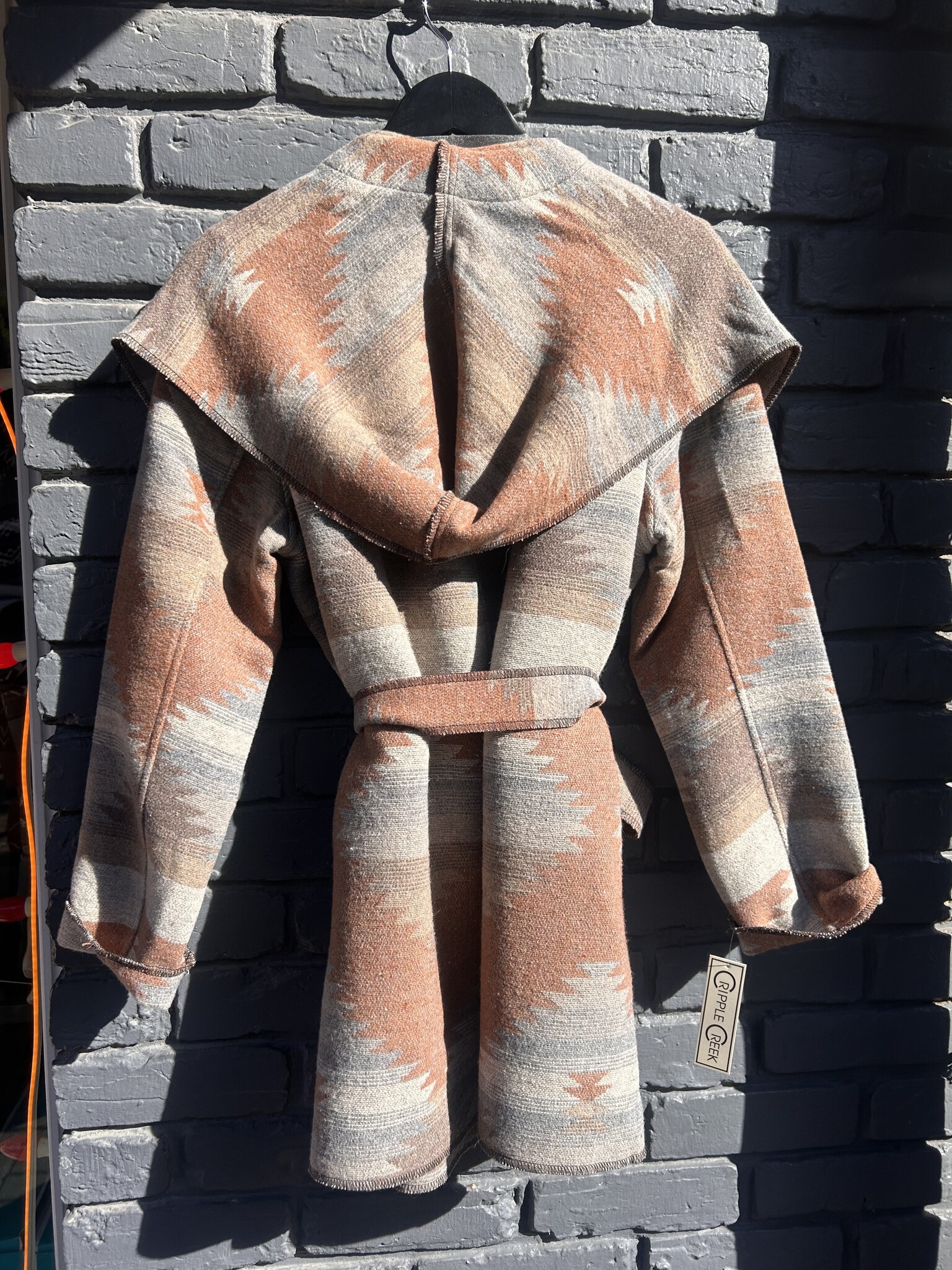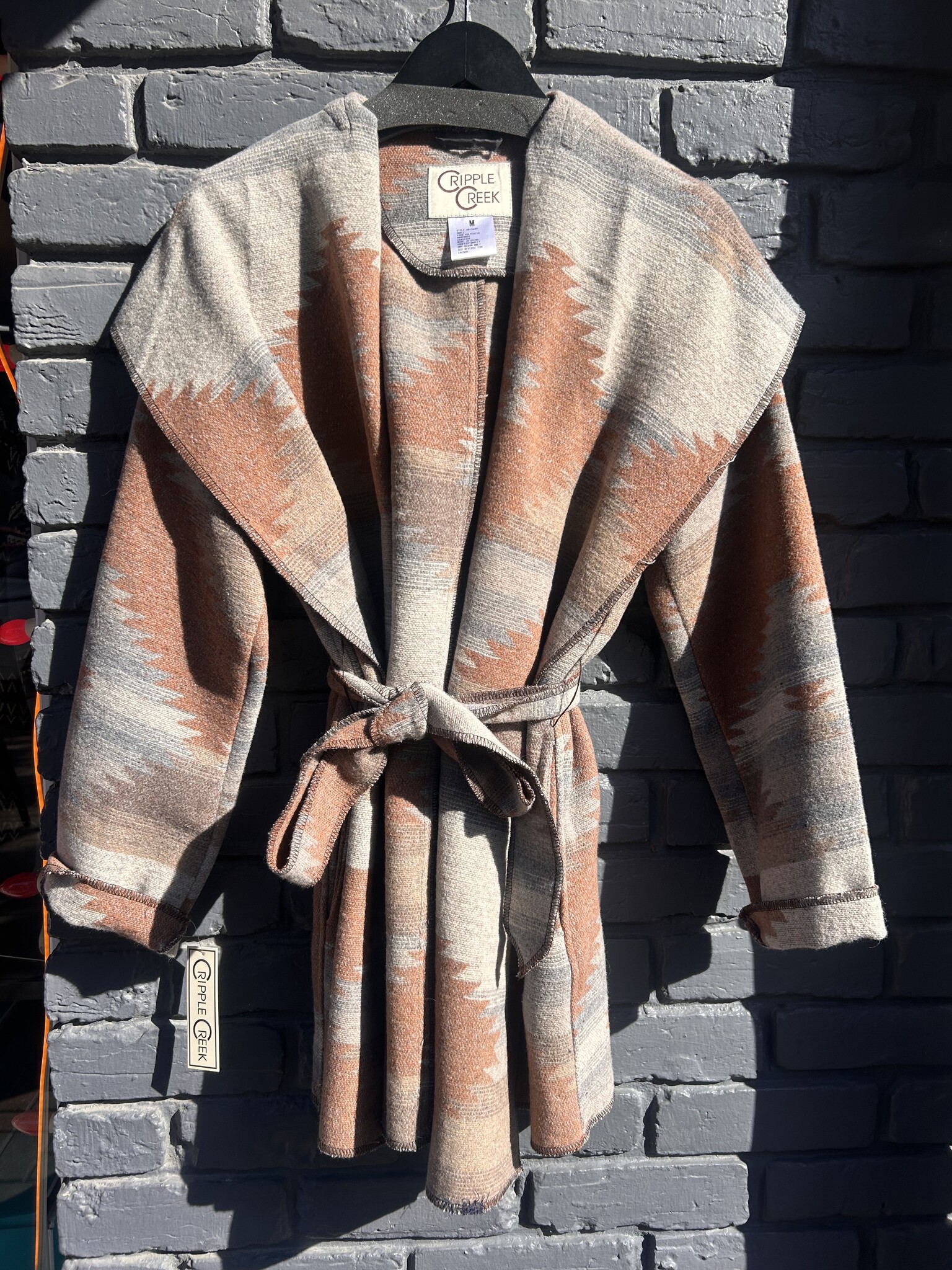 Wrap yourself in timeless Western charm with this Cripple Creek belted coat. Featuring a soft woven fabric in warm desert tones and a subtle southwestern pattern, it offers both comfort and effortless style. The open front and relaxed fit make it perfect for layering, while the waist tie adds a flattering silhouette. Ideal for cool-weather outings or a touch of rustic elegance year-rou