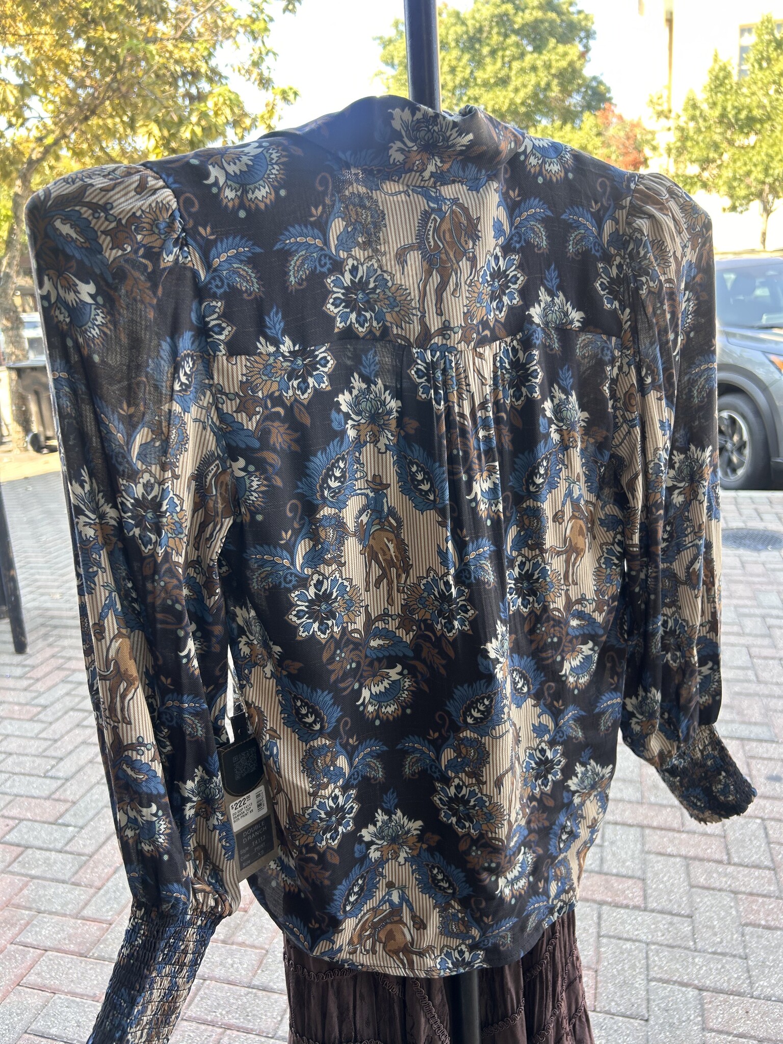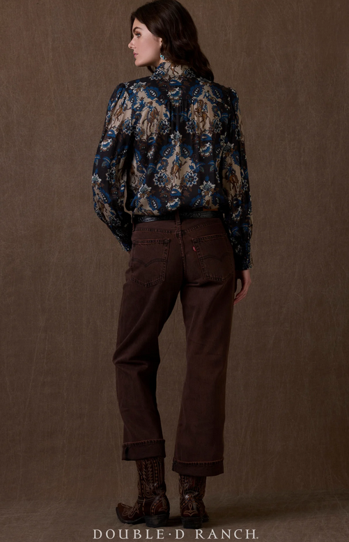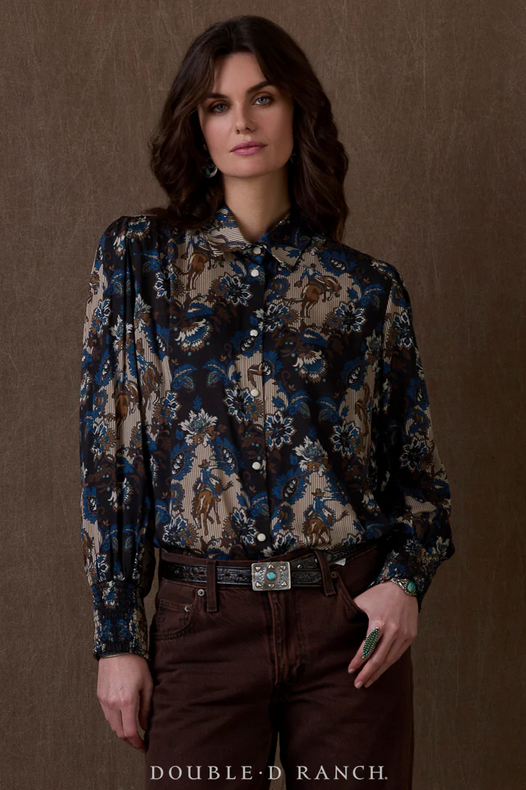 This swoon-worthy custom print brings together the significant hues of the Wash House collection in a dreamy damask with a rodeo-Western spin. This chic button-down is elevated in a luxurious viscose with a contrasting pearl snap placket and lovely smocked cuffs.