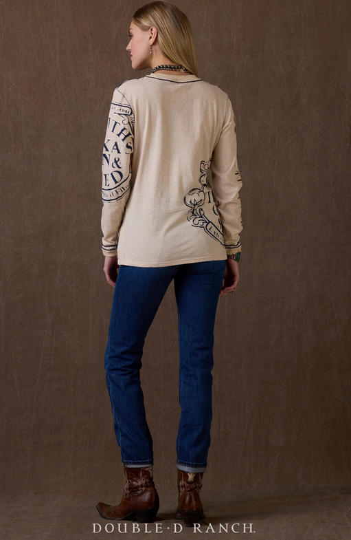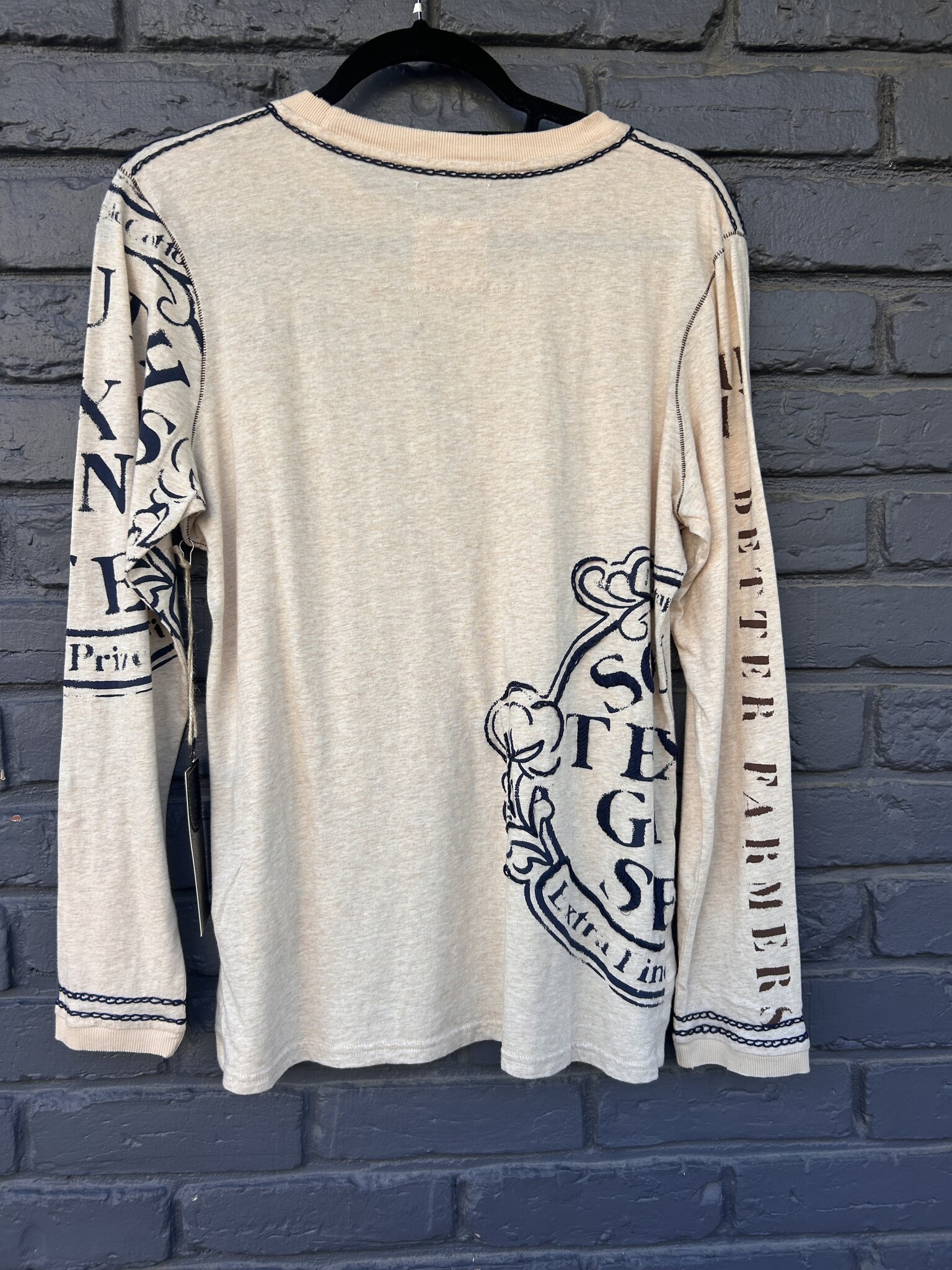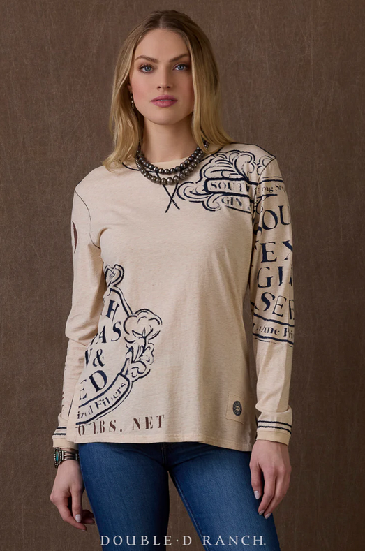 This chic cotton top is a nod to that nostalgia, brought to life in a classic ‘bone’-colored cotton and asymmetrically printed with our own iteration of cotton sack printing.