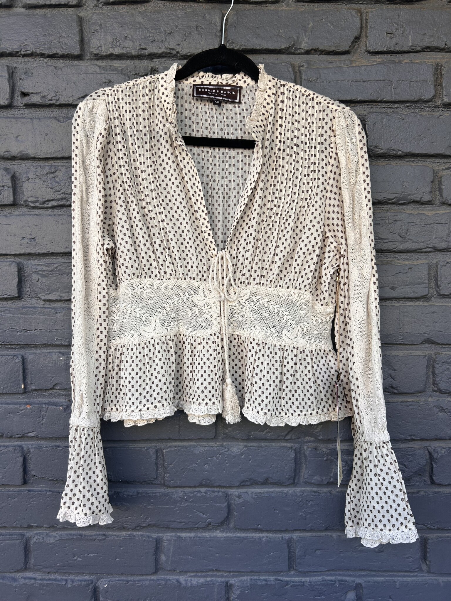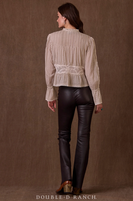 One of the unexpectedly exquisite things we explored in the Wash House collection is interpreting undergarments as outerwear. It’s a trend that’s dominating the most upscale European runways, and it’s authentically in line with what we’d have found in among our trunk treasures at Granny’s. This chic sheer top channels the aesthetic of an old-fashioned dressing gown with a tasseled-tie front and lace panels. It’s dainty and delicate with a decidedly feminine feel.
