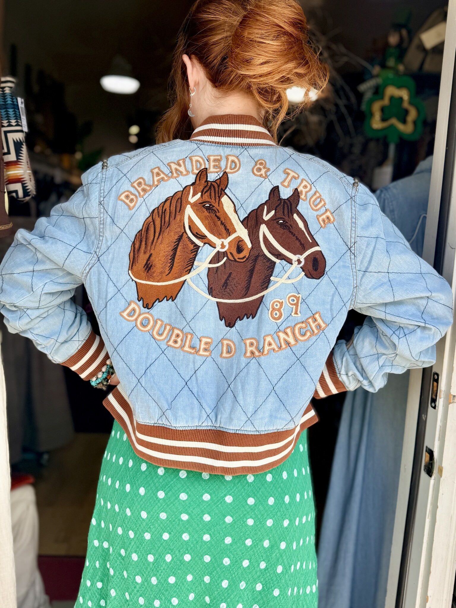 The back makes a bold statement with embroidered horseheads and vintage rodeo-inspired lettering, while the striped ribbed trim adds a nostalgic, sporty touch.