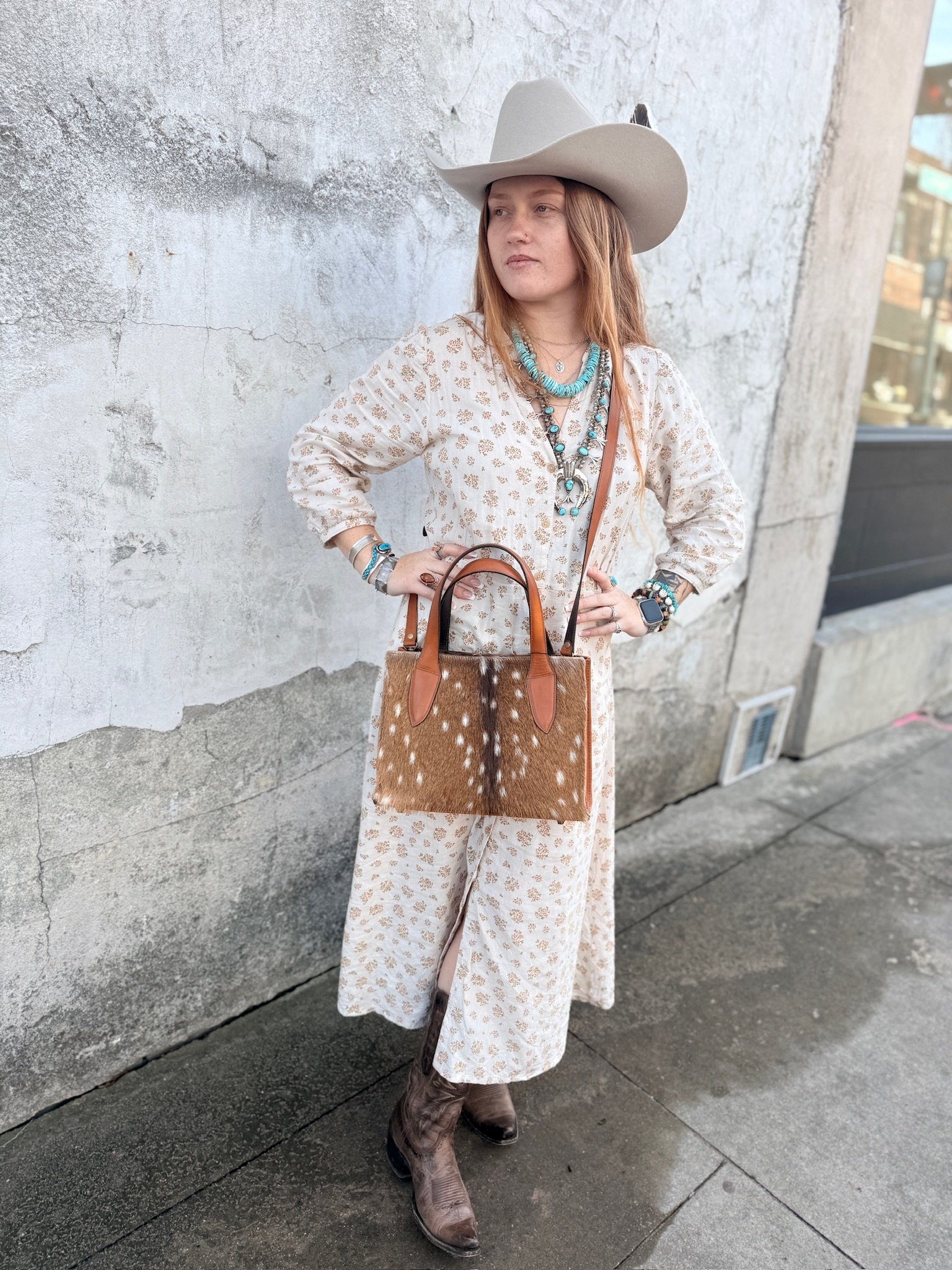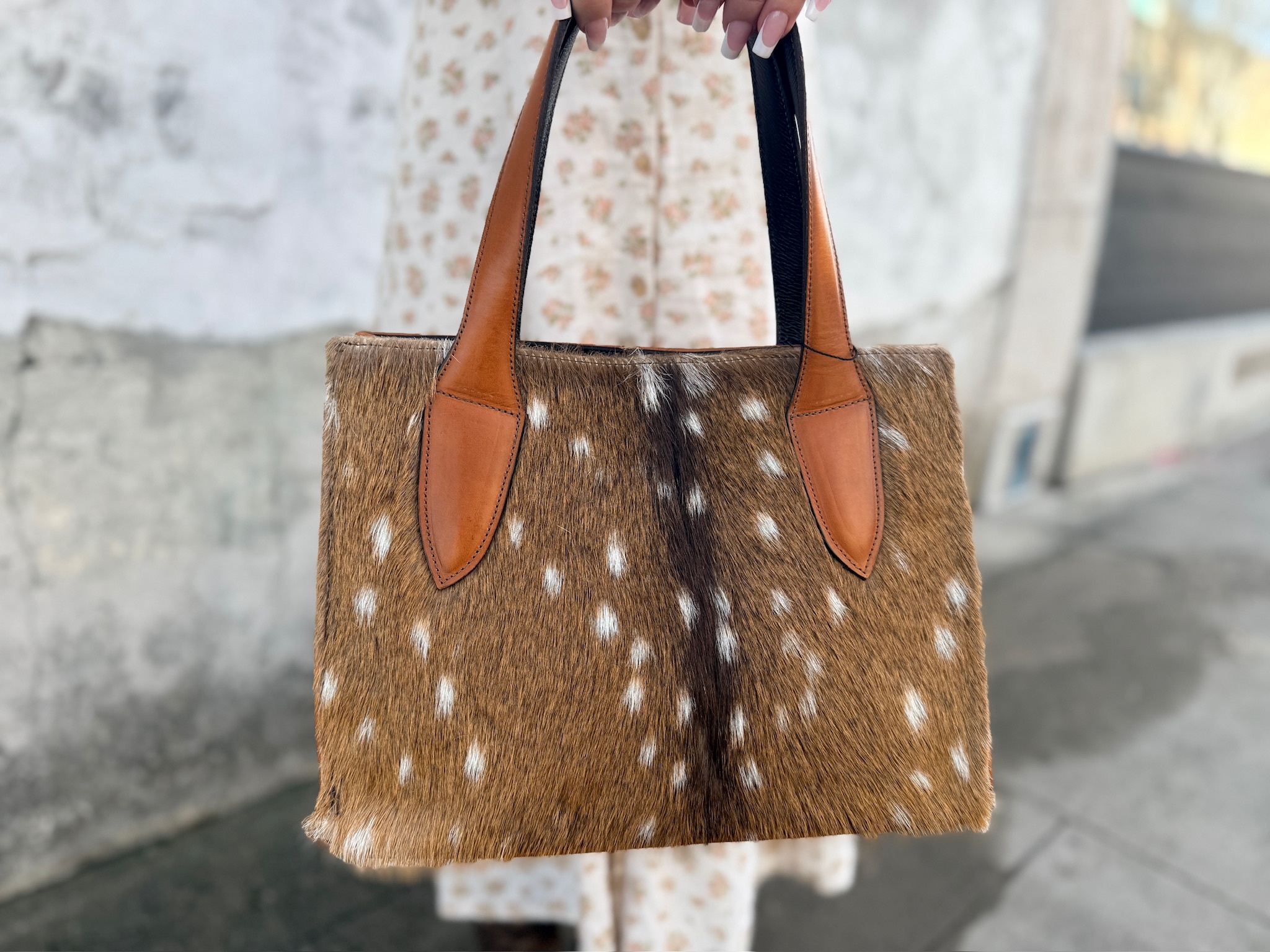 Elevate your collection with this handcrafted masterpiece. Combining striking axis hide with luxurious cognac leather, this timeless handbag transitions seamlessly from day to night. Proudly made in the USA by Juan Antonio.