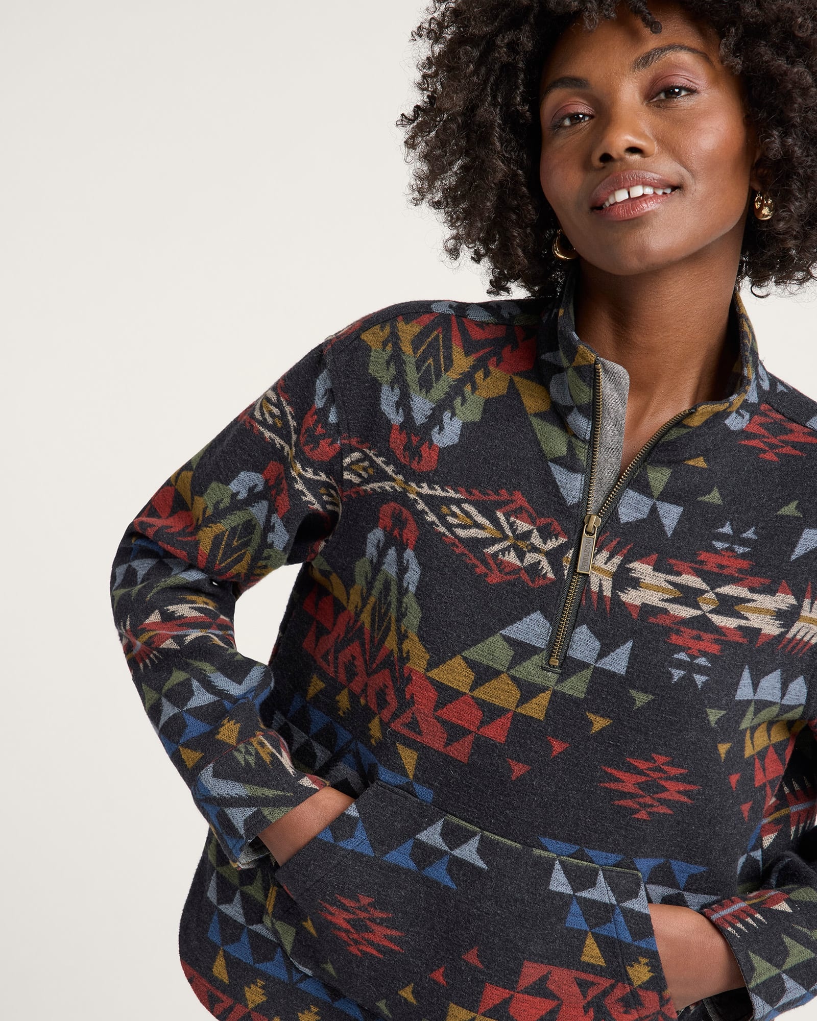 A cozy pullover in Pendleton's DoubleSoft cotton chamois, brushed inside and out for exceptional comfort. Designed with a stand collar, half-zip front, and roomy kangaroo pocket, it's perfect for layering during chilly days. Shirt tail hem adds ease of movement, while the exclusive Autumn Birch pattern brings heritage flair.