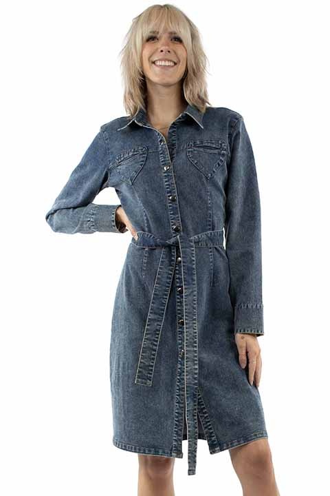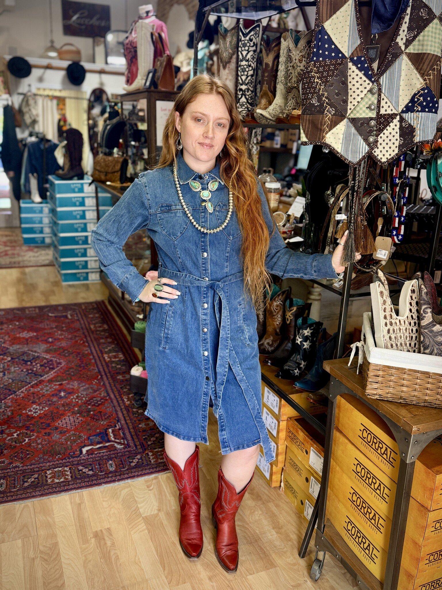 The Scully Heart Pocket Denim Dress is an easy standout, crafted from medium-weight stretch denim for a structured yet comfortable fit. Designed with a flattering A-line silhouette, it features a snap-button front, collared neckline, and a self-tie belt that cinches the waist just right.
