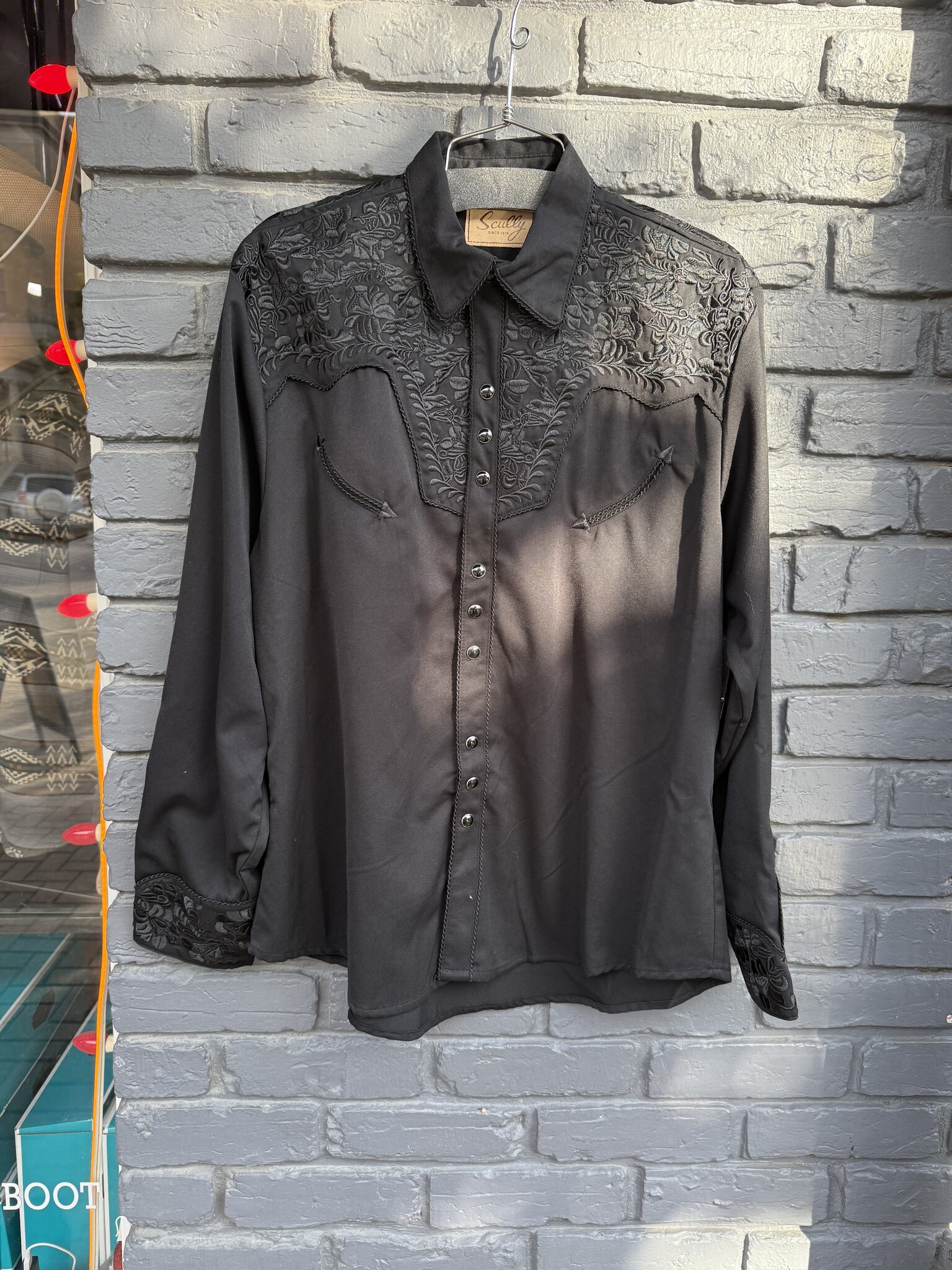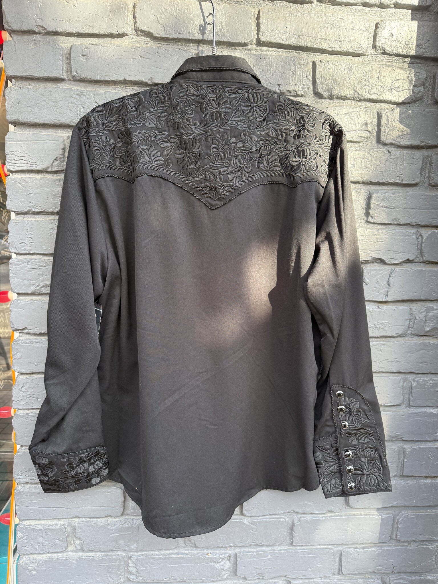 Sleek and sophisticated, this Scully Western shirt combines classic cowboy style with refined elegance. Crafted in jet black, it features intricate tonal embroidery across the yoke and cuffs, complemented by snap buttons and traditional Western piping. Perfect for dressy occasions or nights out, this shirt delivers a modern edge while staying true to timeless Western heritage.