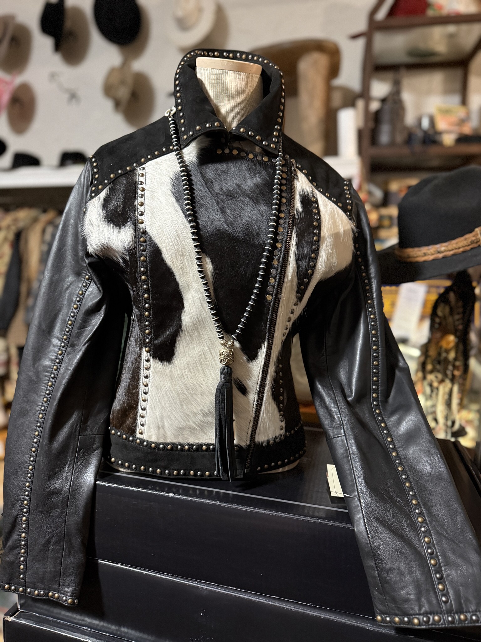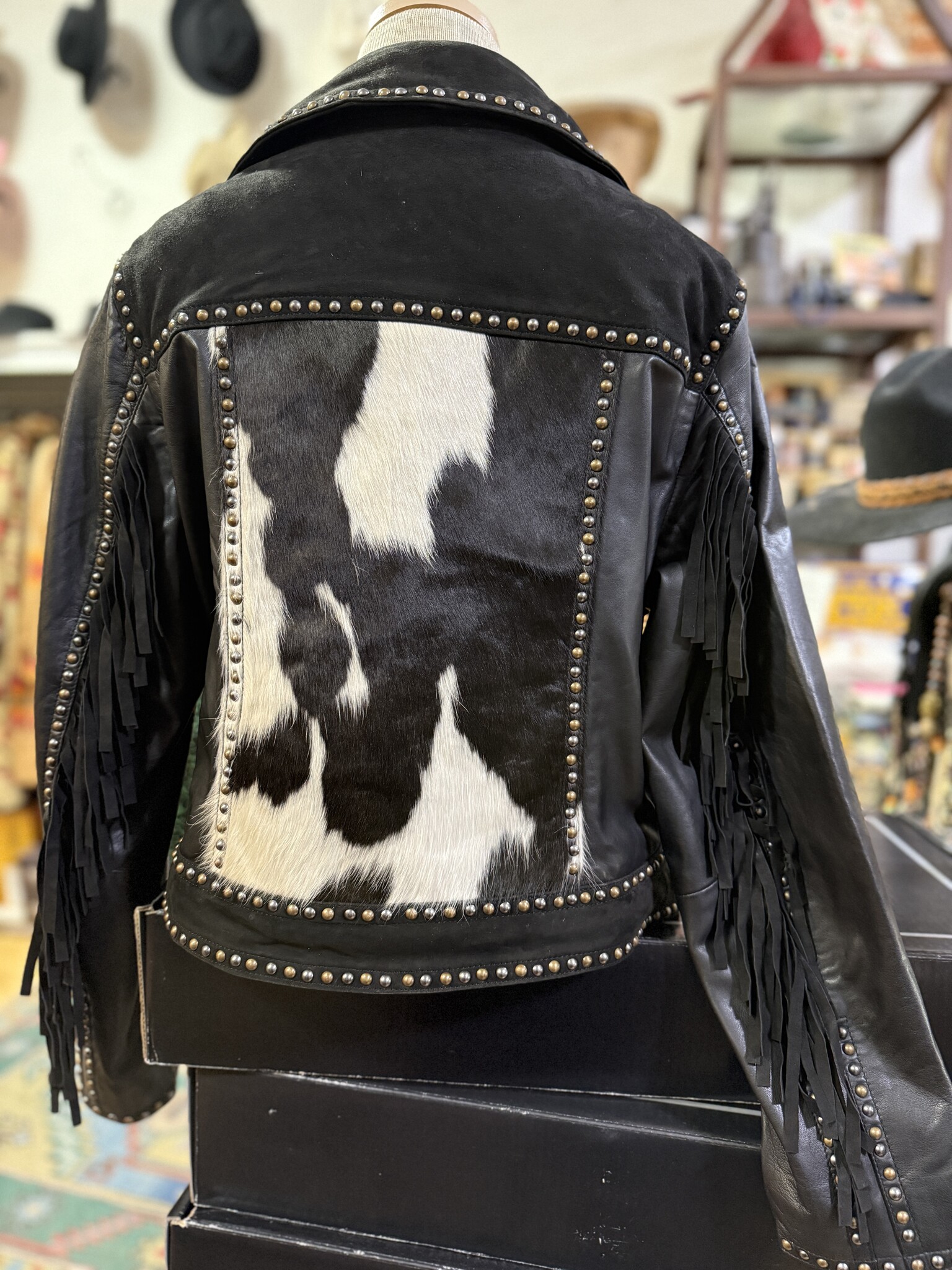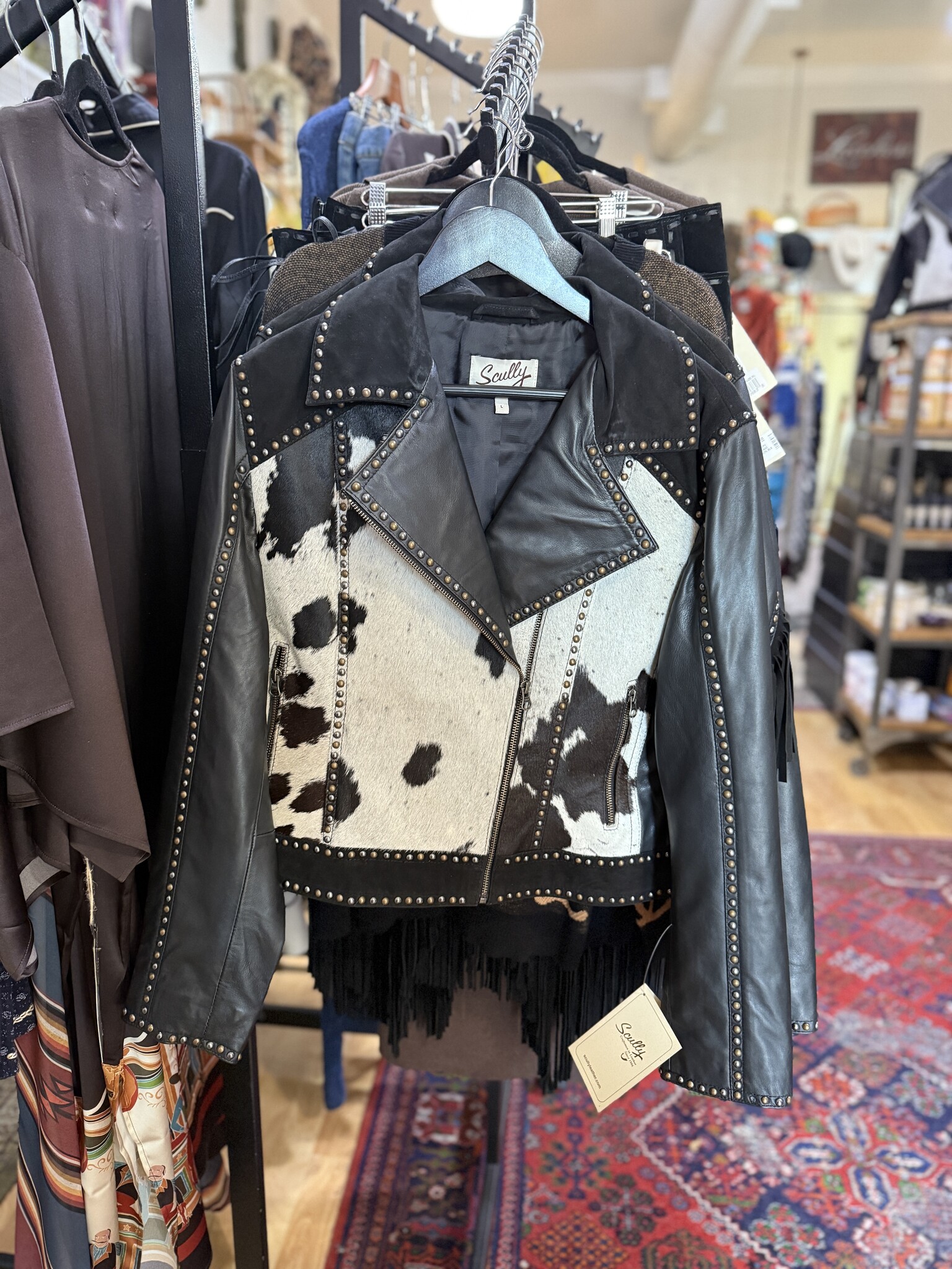 Our Scully Women’s Studded Cowhide Fringe Leather Jacket blends bold Western attitude with high-end moto style — crafted from genuine cowhide, detailed with metal studs, and finished with dramatic fringe for unforgettable movement.