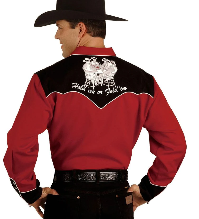 "Hold 'em or Fold 'em" below four cowboys playing poker embroidery on back yoke