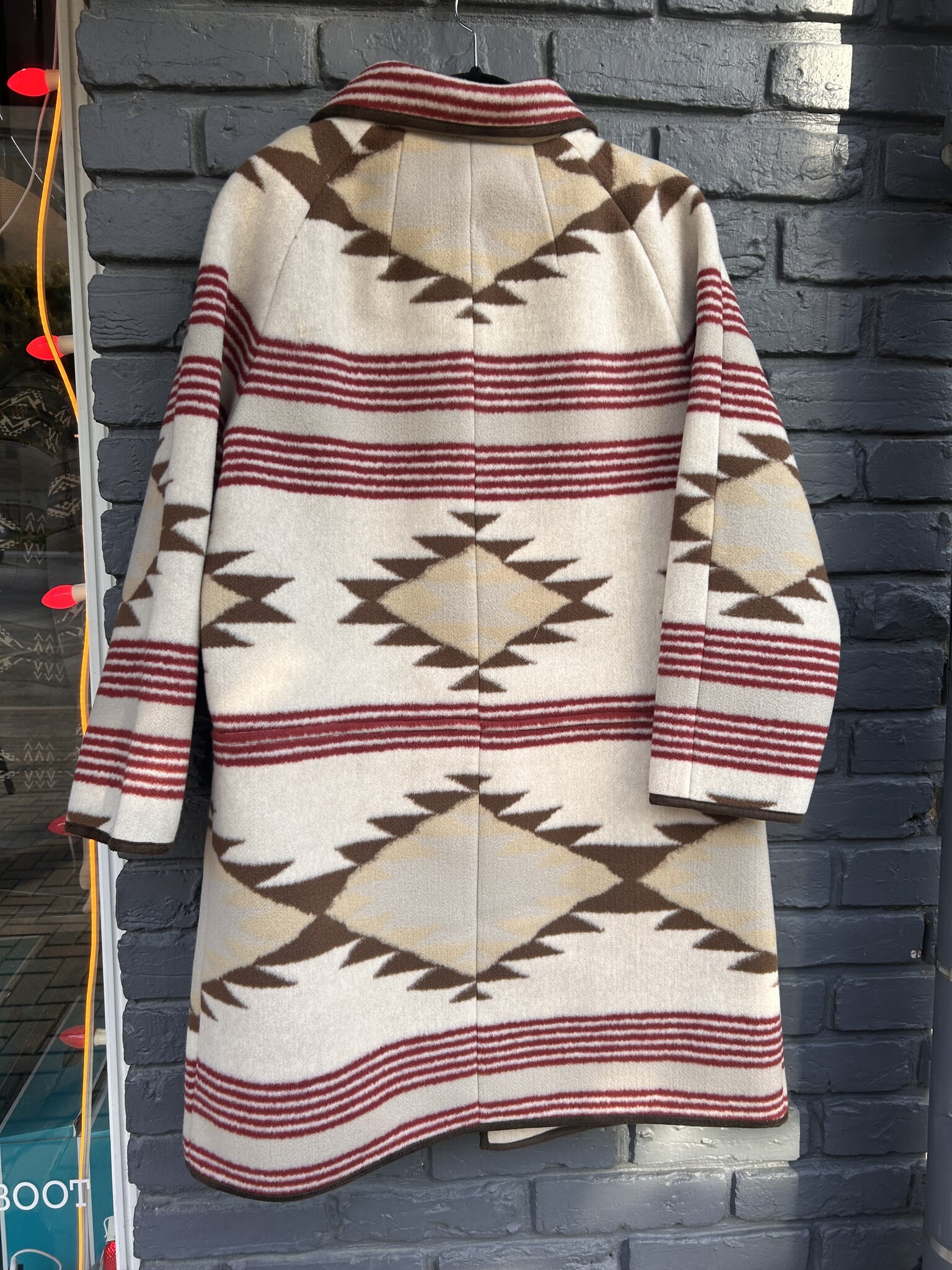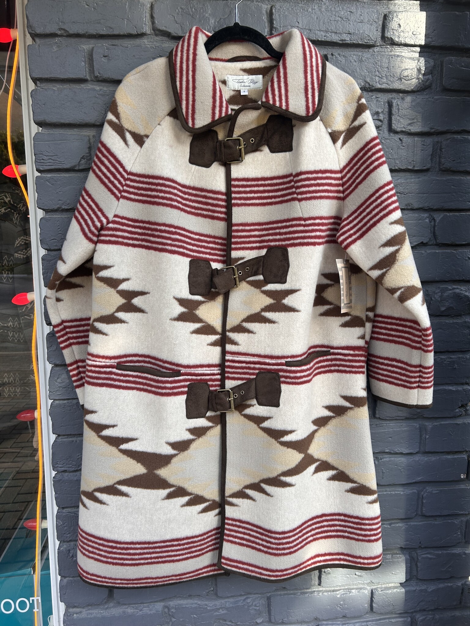 Wrap yourself in Western luxury with this Tasha Polizzi Renell coat. Featuring a bold geometric pattern in warm desert tones with striking red accents, this statement piece blends rustic charm with timeless elegance. The toggle-style front closures with suede straps add vintage flair, while the soft, cozy fabric keeps you warm and stylish through every season. Perfect for layering on chilly days with a touch of classic Southwestern spirit.