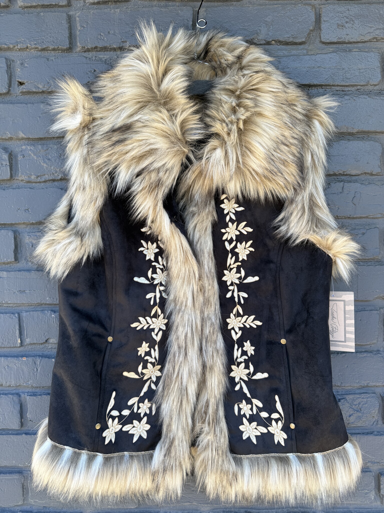 Elevate your Western chic style with this luxurious Tasha Polizzi vest. Crafted from soft black faux suede with tan floral embroidery, it features a plush faux fur collar and trim for a cozy, elegant finish. The sleeveless design includes hand-warmer pockets, hook-and-loop front closures, and a warm faux fur lining—perfect for layering with your favorite fall looks.